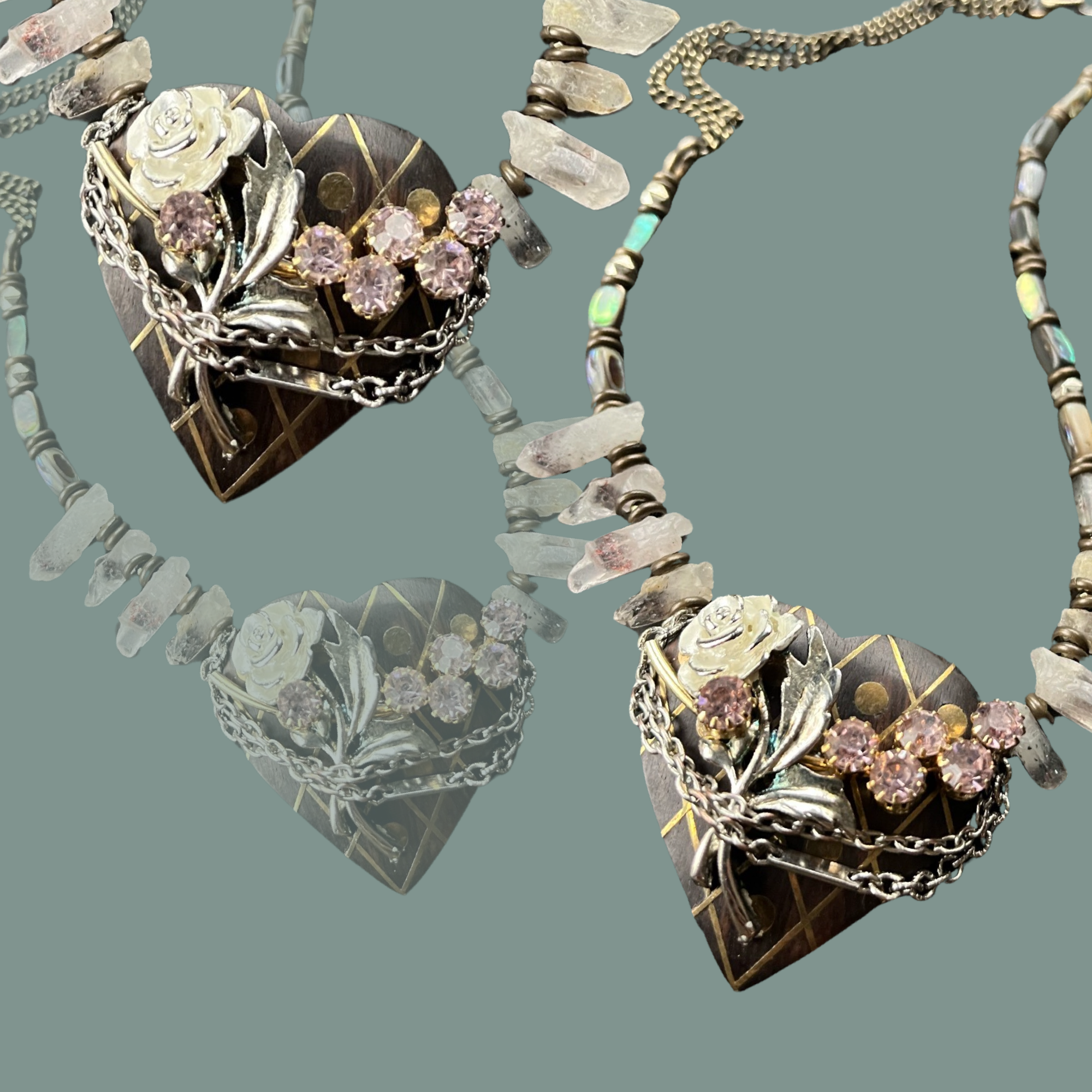 Classic collar necklace with natural kyanite stones and vintage rhinestone fringe drop. Bold, feminine- sweetheart inspired drape. The juxtaposition of the imperfect, natural stones against the classic vintage rhinestone is a statement to modern day living.