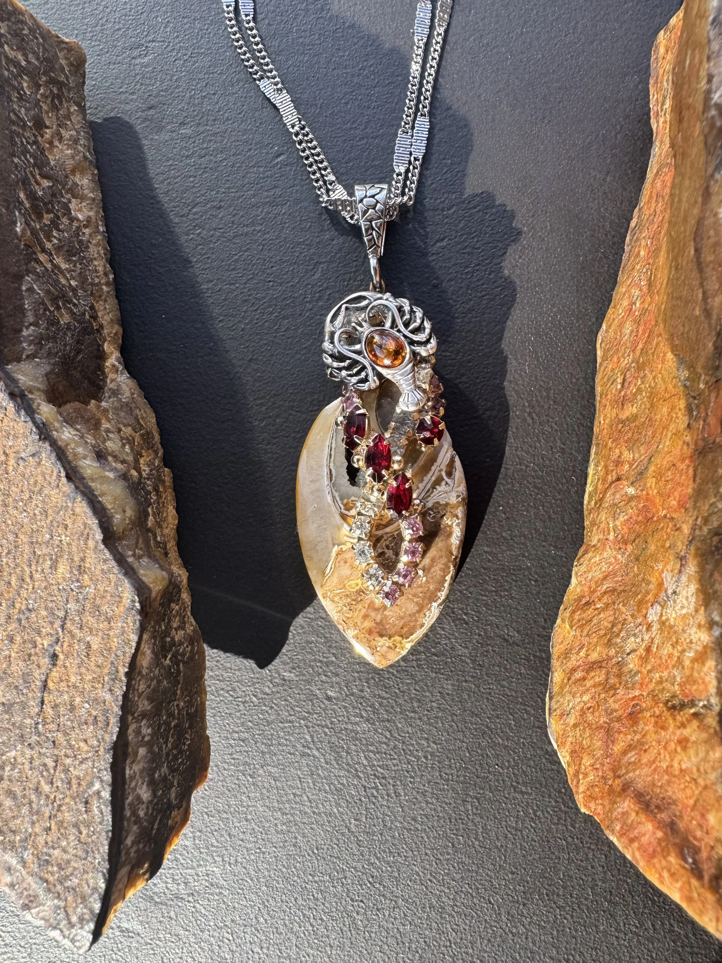 An eclectic, brutalist assemblage necklace composed of vintage rhinestones, sterling scorpion charm and a fossilized druzy shell. An homage to November, the elusive scorpion (my most favorite) of the zodiac. The sterling silver scorpion has a faux amber center and rests on a bed of scarlet red, pale pink and silver rhinestones. The base of the pendant is a teardrop shaped fossilized shell with druzy center. It hangs from a textured silver fob on a double silver chain. A beautiful timepiece to celebrate the scorpion or love of a scorpio.